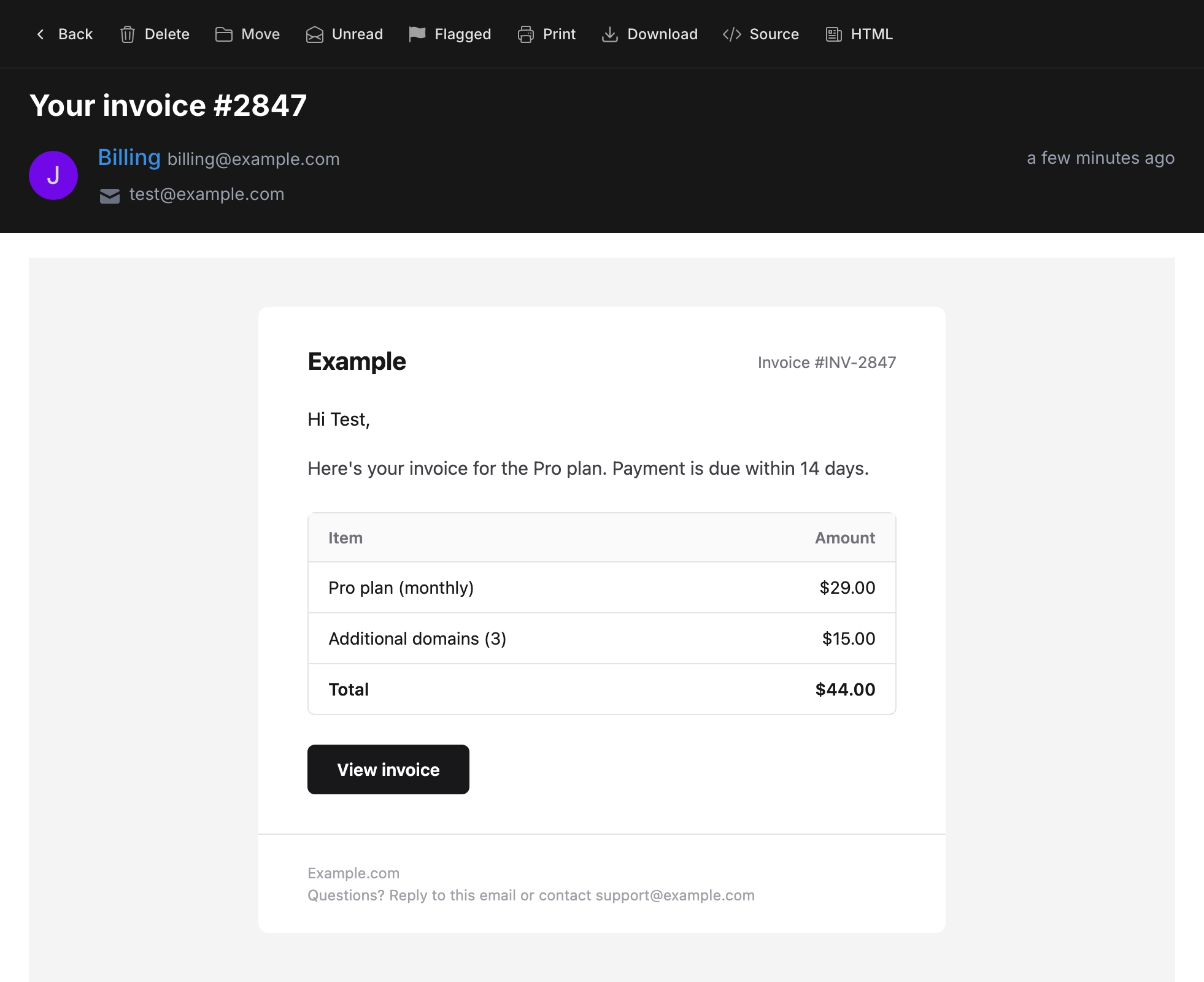 - HTML preview, text, headers, raw source. Plus SPF/DKIM/DMARC results via API.